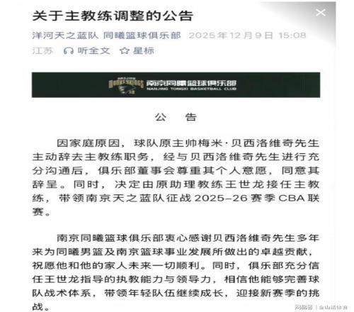 根据同曦俱乐部的公告,原主帅梅米-贝西洛维奇,是因个人都家庭原因,自己主动辞掉主教练职务的。因此,俱乐部决定将原助理教练王世龙转正,接任球队主教练,带领南京同曦征战2025-26赛季CBA联赛。同曦篮球俱乐部对贝西洛维奇为球队作出的贡献,给予了充分肯定,同时也充分信任王世龙的执教能力。