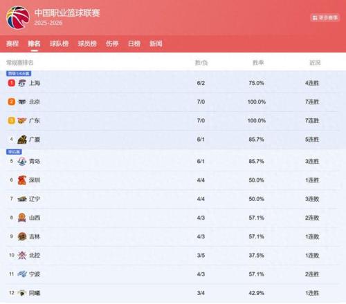 首先从最新的排名我们可以看到,目前上海队排在榜首,北京队排在第二,广东队排在第三。而广厦队这些球队也都进入了前五。对比之下,辽宁队这些球队则是没有能够进入前五,排在第七名。另外,还有一支七连败的球队也已经诞生。